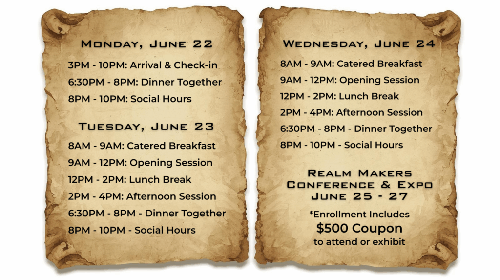 $500 coupon to attend or exhibit at Realm Makers Conference & Expo, PLUS complimentary meals with faculty!